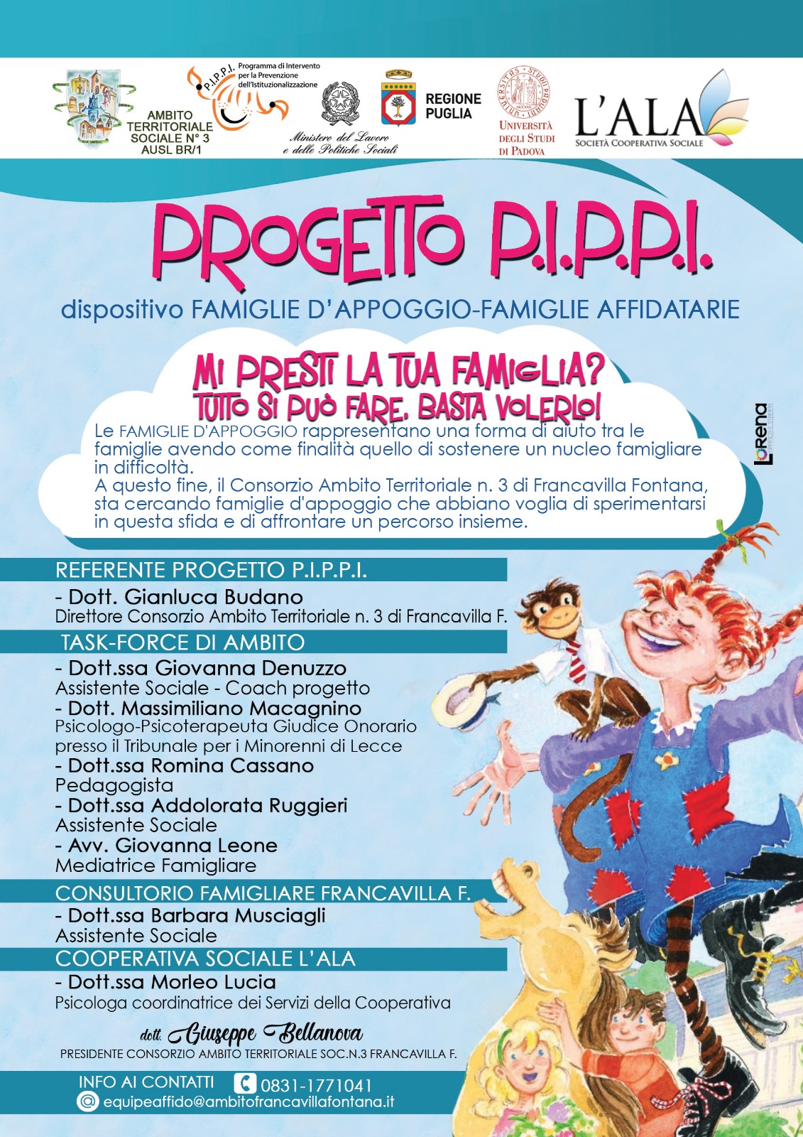 L’Ambito Territoriale n. 3 di Francavilla Fontana, con altre realtà italiane, ha aderito alla seconda sperimentazione del Programma P.I.P.P.I. (“Programma di Intervento Per la Prevenzione dell’Istituzionalizzazione”) che si rivolge alle famiglie con figli di età compresa tra gli 0 e gli 11 anni che si trovano a fronteggiare situazioni impegnative in cui può risultare difficile garantire ai figli e a tutta la famiglia un giusto benessere.