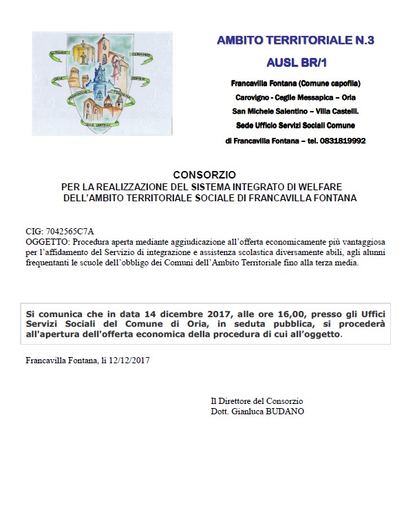 Si comunica che in data 14 dicembre 2017, alle ore 16,00, presso gli Uffici Servizi Sociali del Comune di Oria, in seduta pubblica, si procederà all'apertura dell'offerta economica della procedura di cui all’oggetto.